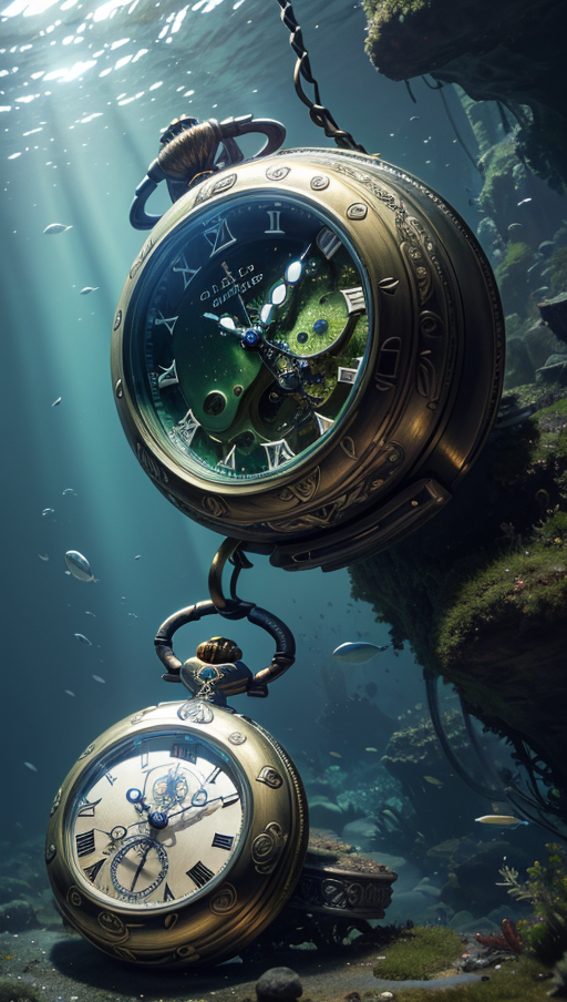 hyper detailed masterpiece, dynamic realistic digital art, awesome quality,group activities time-traveling pocket watch,dedication underwater,small space junk atmospheric scattering,supermassive, green,oxygen-rich air,hydraulics,fierce,enjoyable,zestful,stark beauty,grand,innovative,gentle