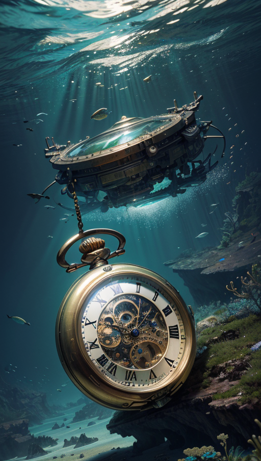 hyper detailed masterpiece, dynamic realistic digital art, awesome quality,group activities time-traveling pocket watch,dedication underwater,small space junk atmospheric scattering,supermassive, green,oxygen-rich air,hydraulics,fierce,enjoyable,zestful,stark beauty,grand,innovative,gentle