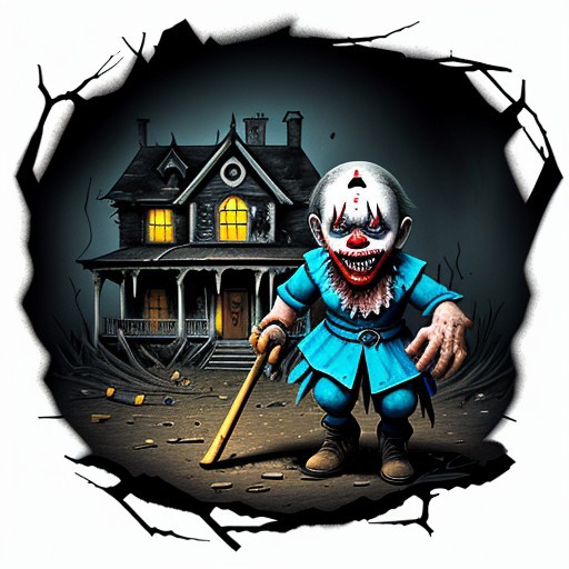 A hauntingly detailed illustration of a terrifying killer clown wearing a blue dress, carrying a blood-covered hacksaw. The clown is entering the eerie, dilapidated old house of the grandparents, with a sinister grin on its face. The background reveals a minefield and other deadly weapons scattered throughout the house. The top of the image features the bold, capitalized text "CLOWN BURDEN" in a striking font. The overall atmosphere is one of dread, horror, and the burden of a twisted fate.