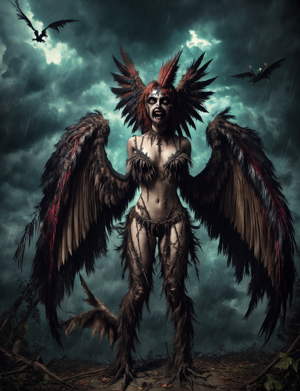 DonMCr33pyD0115 harpy, mix of human and bird features, humanoid upper body, sharp claws, feathery wings, powerful, , varied coloration, distinctive and eerie screeching, stormy weather and winds, vengeance, punishment, wild, predatory, malevolent , <lora:DonMCr33pyD0115:0.8>