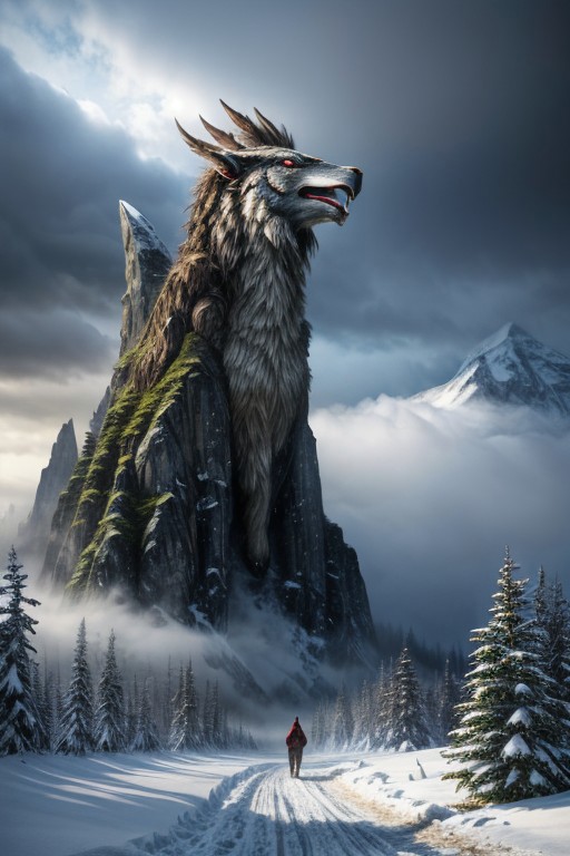 masterpiece, best quality, absurdres, illustration, photorealistic, towering peaks, snow-capped, ancient ruins, mist, glowing runes, mythical creatures