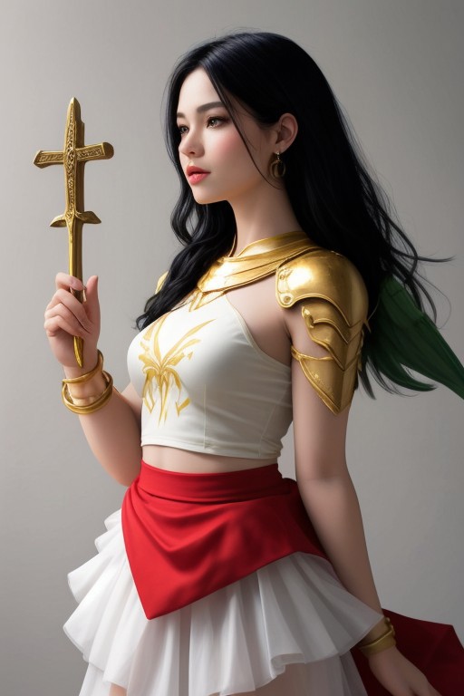 Female angel Gabriel with long curly blue hair, no bangs on the forehead, and green skin. A pair of angel wings with green framework and white feathers. Wearing silver cross earrings, golden breastplate covering the upper body, golden shoulder armor, golden bracelets, a gradient long skirt divided into three layers (the outer layer is a white short skirt with red horizontal stripes at the hem, the middle layer is a white knee-length skirt with red horizontal floral patterns at the hem, and the inner layer is a red ankle-length skirt with white circular spots at the hem), golden leg guards, holding a white lily in the left hand, and a cross sword in the right hand. Forearms raised and spread to both sides. FHD, masterpiece, realistic style.