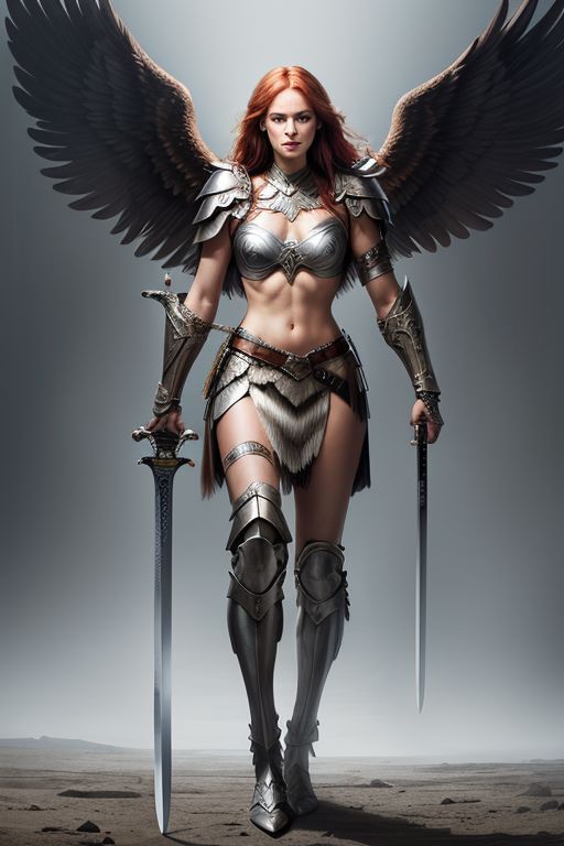 photorealistic image, masterpiece, high quality UHD 8k, of a beautiful woman, full body, long red hair, blue eyes, freckles, slim body, thin waist, medium chest, perfect body, (fantasy valkyrie armor, intricate details), ((grasping a large sword with two hands)), (((full body view))), sharp focus