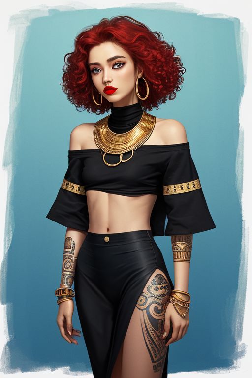 Girl, red hair, curly, long, very long, blue eyes, bright blue, makeup, red lipstick, bright red, golden necklace, Egyptian style necklace, golden neckpiece, piercing, many piercings, golden piercings, short blouse, tight blouse, small breasts, exposed shoulders, short sleeve, shoulder revealing sleeve, sheer sleeve, see through, gold rings, jewelry, enhanced jewelry, short thong, silk thong, long thong, tribal, blue tattoos, belly tattoos, leg tattoos, blue , divine light, golden, palace, Aztec palace, rivers