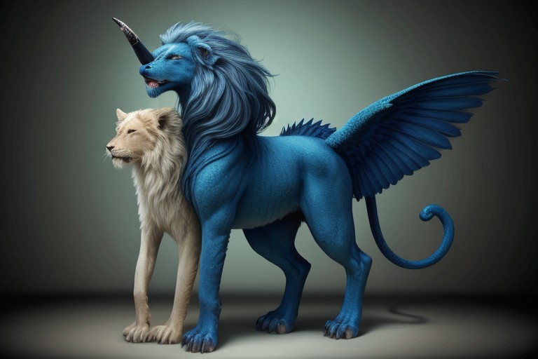 A chimera, shaped like a blue lion, with a long silver horn growing out of the center of its forehead, a golden mane on its head, and a pair of blue wings growing out of its back. It has two The tail grows into two green snakes. FHD, masterpiece, realistic style.