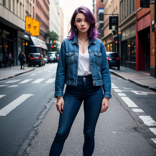 Motion picture still, full body shoot of a young woman standing casually and wearing denim: ultra detail, girl, realistic, correct anatomy, vibrant colors, masterpiece, sharp focus, best quality, depth of field, cinematic lighting, long straight purple hair, tan complexion, purple eyes, softly angled eyebrows, round lips with coral lipstick, straight nose, freckles, black denim jacket, blue jeans, outdoors, urban setting