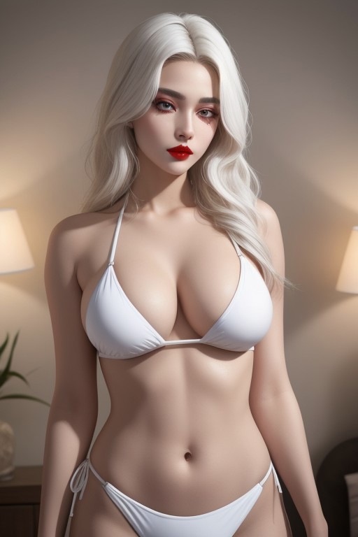 Lady_Death, 1girl, solo, long hair, large breasts, white hair, nail polish, lips, makeup, colored skin, lipstick, pale skin, red nails, red lips, white eyes, no pupils, blank eyes, <lora:Ladydeath:0.8>, (masterpiece:1.2, best quality:1.2, beautiful, high quality, highres:1.1, aesthetic), detailed, extremely detailed, ambient soft lighting, 4K, perfect lighting, <lora:GoodHands-beta2:1>, nice hands, perfect hands, venus bikini, <lora:venus_bikini_v0.1:1>