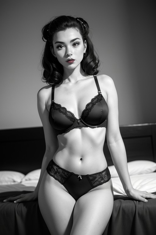 1940's photograph of 20 year old woman, enormous breasts, Victory rolls, red bold lips, wearing Peach satin bra with intricate lace and matching high-waisted panties, Elegant bedroom, Speed Graphic, 127mm f/4.7, 1/200s, ISO 50, Kodachrome