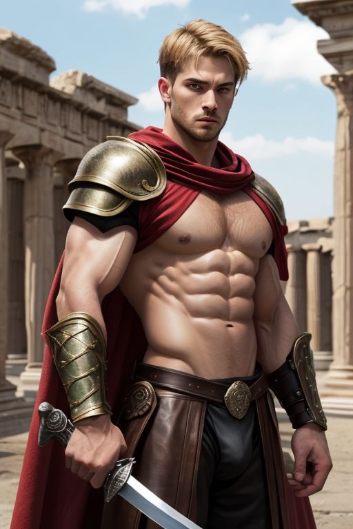 1man, (spartan warrior), <lora:Clothing - Spartan Armor:0.7>, spartan armor, (leather briefs), muscular, long red cape, holding a sword, young, handsome, tall, perfect face, green eyes, perfect eyes, blonde hair, masculine, defined abs, six pack abs, defined muscles, big strong hands with large hairy knuckles, (round shield), looking at viewer, determined look, grim, dynamic pose, in battle, ancient Greek temple in the background, masterpiece, (best quality, HD, detailed face, best quality, semi-realism, perfect anatomy, refined character, highest detailed, looking at viewer,