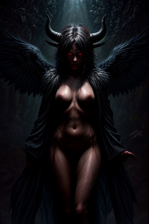 A moan in the twilight, a ring of bells, and suddenly you're face to face with a bulky soul of fury and blood. Two ebon eyes stare at you with a terrifying grimace, and another moan surges from its bony mouth with a most putrid smell. Four jagged horns adorns its wide head, which itself is covered in blisters and soils. Oozing magma escapes the creature's twisting nostrils set within a stubby nose. Its wide head sits atop a slim, powerful body. An oddly gorgeous robe covers its torso, perhaps the remnants of an encounter in a different world. The creature moves closer to you, its two legs steadily carry its infernal body with a hurried energy. A bony tail writhes behind it, coarse hairs cover it sporadically. Two narrow wings extend themselves fully. Spiky bones, and fiery feathers stretch upward over the creature. The creature no longer looks at you, it has lost interest.