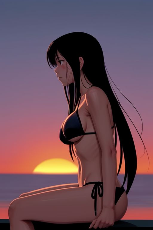 Minimalist, solo girl, sitting, bikini, profile, sunset background, high contrast, top half, long hair, anime minimalist, Caucasian, sensual pose, medium breasts, pointing breast, sweaty