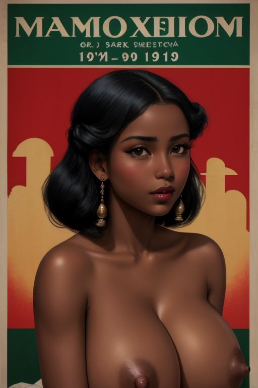 colorful vintage style advertisement, poster, ad, mexican propaganda, beautiful mexican young lady, (black girl:1.1), 1910s housewife, exterior, (massive breasts:1.1), (saggy breasts:1.1), (topless:1.1), strapless, bare shoulders, collarbone, portrait, sexy, smirking, pretty hands, seductive expression, (dark skin:1.3), wearing 1910s attire, mexican style, Mexican Revolution, erect nipples, puffy nipples,