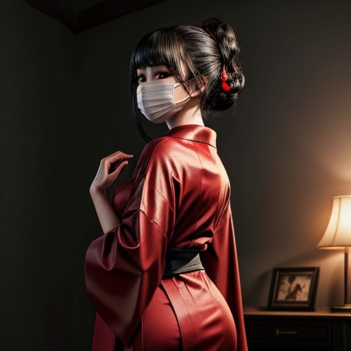 high res, good quality, accurate face, ((high resolution:1.2), (hi-res:1.2), masterpiece, best quality), The Lady (Little Nightmares), wearing a white solid porcelain mask , Sexy woman, Masked face, dimly lit room, Red bra, long black hair, Red panties, curvy body, hair bun, Thick thighs, massive ass, stripping clothes, video game character, Little Nightmares, Red long kimono, Taller woman, in a dark room, half naked,