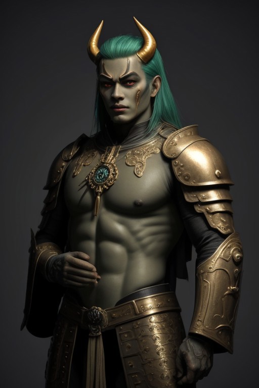 A male Japanese ONI, bald, with green horns on both sides of his head, sharp teeth, strong physique, and green skin color. Wearing VR goggles on both eyes and a full set of golden Chinese general armor. FHD, masterpiece, realistic style.