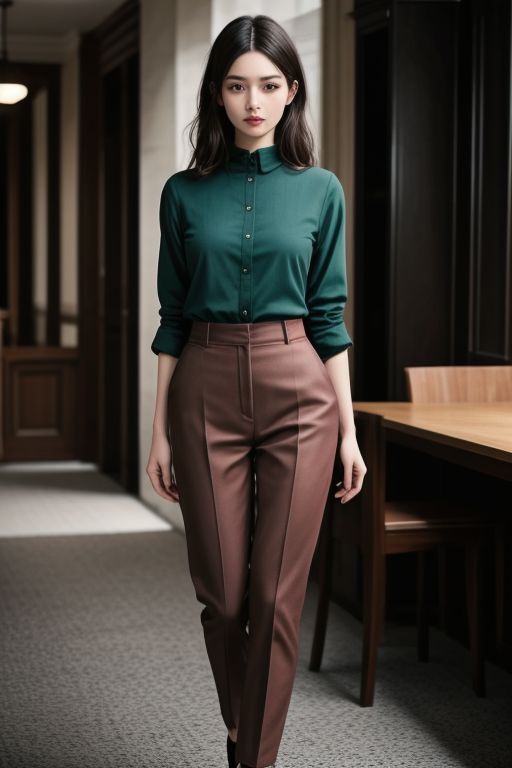 woman good complexion, dressed vibrant green buttoned shirt no sleeves, standing elegantly crimson chair, duplicated chairs adjacent, forming coherent row; red headscarf encases hair