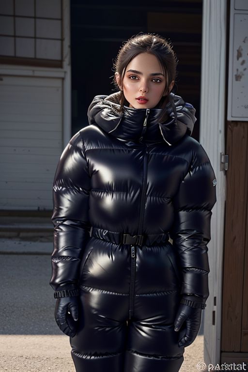 very realistic, A stunning portrait of a young, slim, cute, sweet European woman, 20 years old, radiating elegance and beauty. She is dressed in a fashionable, colorful, shiny and glossy extra puffer downcoat outfit. ((High Yoked)). The lighting is soft, highlighting her features and emphasizing the glossy texture of her clothes. Cinematic lighting, very cold, high resolution, winter fashion, realistic shading, digital painting, artstation, sweetest, cutest, ((tempting)). by Parkasite. <lora:Parkasite_v10:0.8>