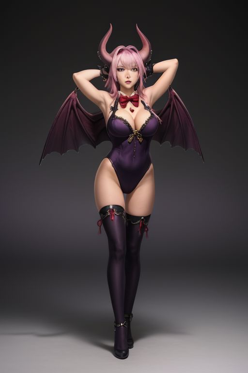 (masterpiece, best quality:1.4), insaneres, absurdres, solo, looking at viewer,BREAK Pasties_houtengeki_cattleya_ownwaifu, 1girl, green eyes, bangs, long hair, pink hair, pointy ears, demon girl, demon horns, demon wings, hair intakes, demon tail, huge breasts, hair between eyes, purple horns, heart pasties, breastless clothes, bare shoulders, cleavage, purple gloves, black thighhighs, highleg leotard, frills, bowtie, red bowtie, (watson cross, arms behind head, full body), shadow, halftone background, shoes, <lora:ANIME_houtengeki_cattleya_ownwaifu:0.8> , depth of field, solo,