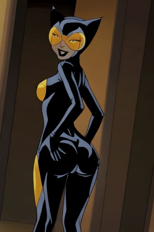 makeup, smile, looking at viewer, black lips, goggles, yellow eyes, parted lips, full latex catsuit, hands on the hips, bent over, cat ears, ass pose