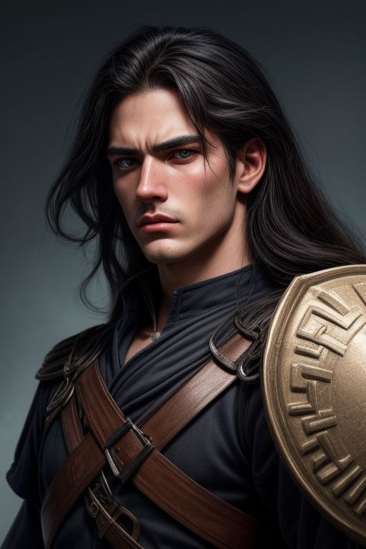an ancient Greek soldier, 25 years old, wears a well detailed battle costume ,well detailed muscular body, swinging well detailed sword, holding a well detailed shield, well detailed handsome face, long face, square shaped jawline, well detailed long pointed nose, well detailed fierce eyes, rage, well detailed medium long black hair, waving hair, at a well detailed battlefield, well detailed image, HD image, 4K image, medium close-up image.