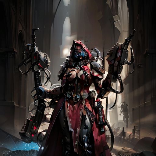 The big breasted female Adeptus Mechanicus, a member of the cult of machines and technology in the Warhammer 40,000 universe, is usually depicted wearing a distinctive black and red mechanized suit studded with machine symbols and sacred hieroglyphs. They have cybernetic prostheses that replace lost body parts, and their faces are partially hidden under a hood or mask with monitors and LEDs. The Adeptus Mechanicus is also often armed with energy and combat mechanical weapons, their form and function associated with the cult of technology and the belief in the sacred machine deity, Omnisiah, red cloak <lora:adeptus:0.5>, exposed cleavage, exposed bimbo lips,