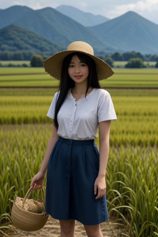 autumn, countryside, rice fields, golden rice, sunshine, mountains, bumper harvest, sun, 1girl, solo, long hair, black hair, red eyes, sun hat, blue skirt, dirty clothes, light smile, muddy