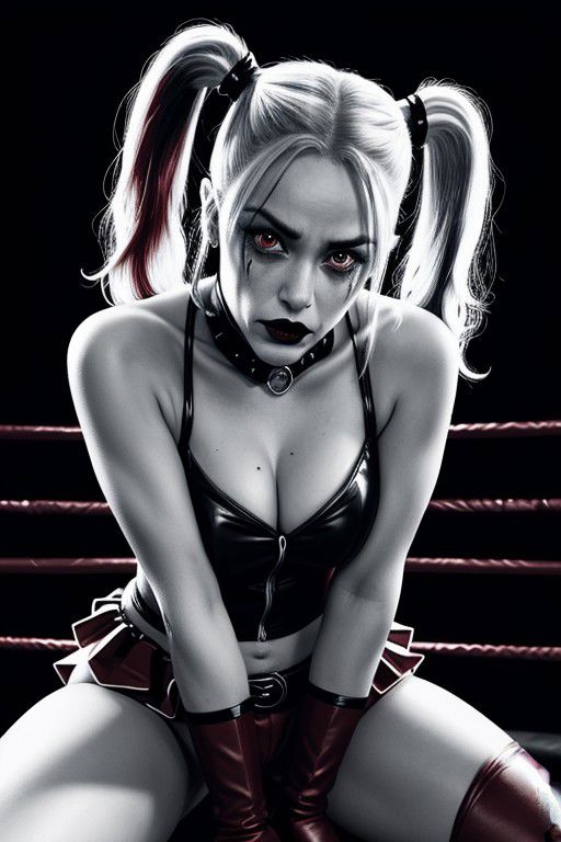 <lora:wrestlers:0.7> harley quinn sitting on neck, (((from below))), (dominant pose), looking at viewer, (eye contact), pigtails, black and red outfit, arm wraps, black lips, angry, cowboy shot, fighting ring background, solo, masterpiece, high resolution, hd, 8k, shallow depth of field