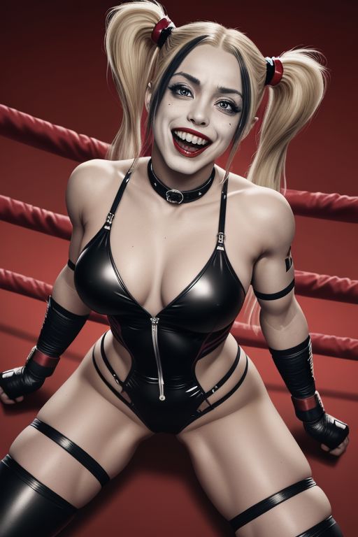 <lora:wrestlers:0.7> harley quinn standing on me, (((from below, very low perspective))), (dominant pose), looking down at me, (eye contact), holding handcuffs, pigtails, black and red outfit, arm wraps, black lips, evil dominant laugh, cowboy shot, fighting ring background, solo, masterpiece, high resolution, hd, 8k, shallow depth of field
