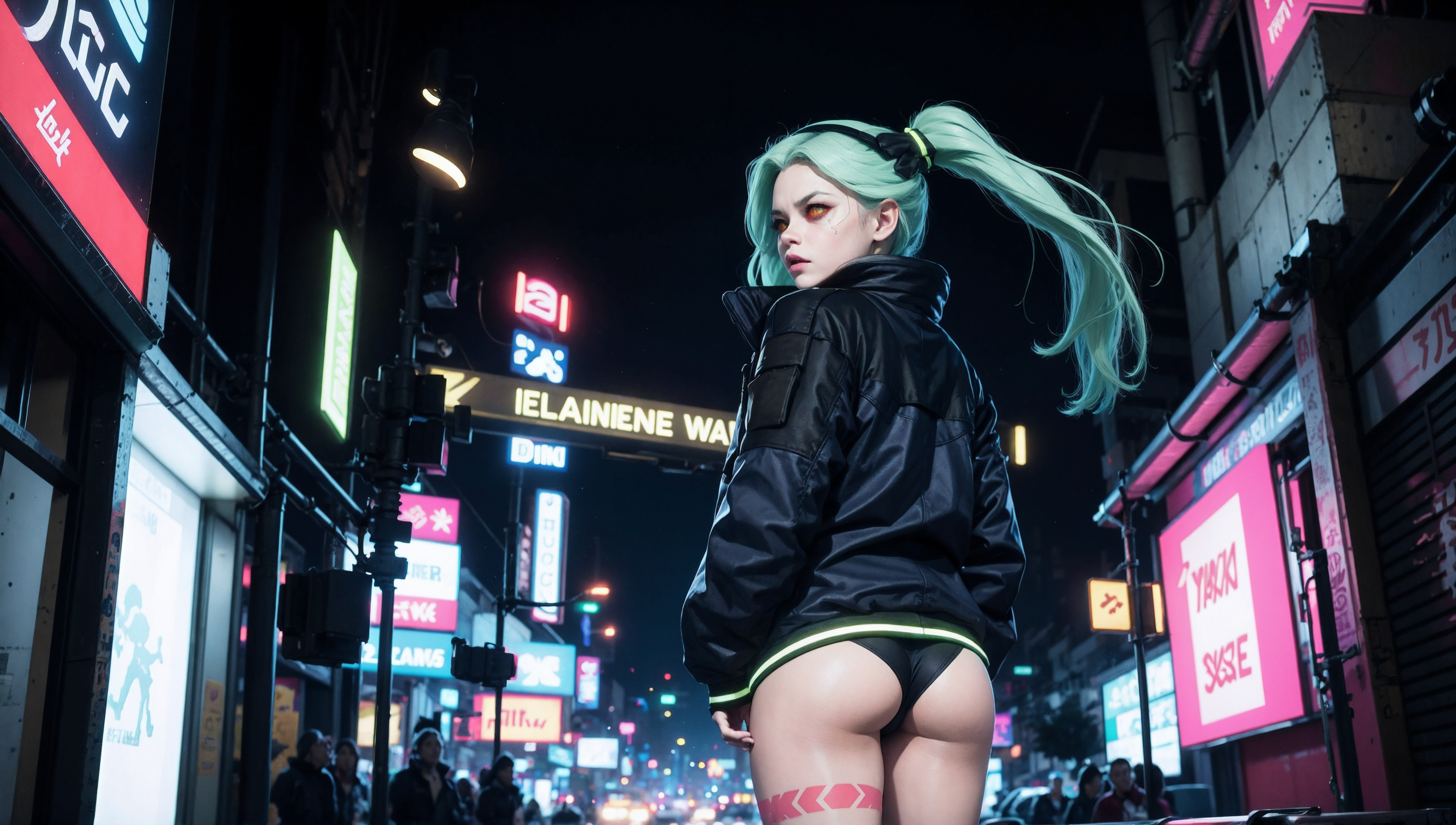 ((best quality)), ((detailed)), ((masterpiece)), Rebecca walking in a depressed looking alleyway, futuristic, cyberpunk, solo, <lora:rebecca_v1:0.9> 1girl, rebecca \(cyberpunk\), solo, twintails, black hairband mechanical eye, colored sclera, red sclera, colored skin, white skin, leg tattoo, neck tattoo, green hair, thong, red pupils, skin fang, red eyes, black jacket, thick ass, cinematic, illustration, <lora:ass_from_below:0.6>, ass_from_below, night, dark sky, neon hue, wide shot, hands in jacket pocket, vibrant
