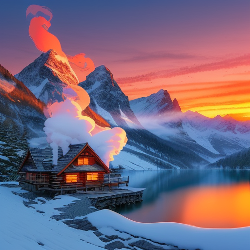Realistic anime comic styled, vibrant sunrise, snowy mountains, pristine alpine lake, cozy log cabin with smoke from the chimney