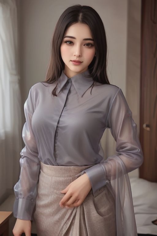 Stunning dark-haired woman with a saree and blouse that highlights her figure. She has large, round eyes accentuated with kohl and enhanced by a touch of lipstick. With a gentle smile and an eye-catching