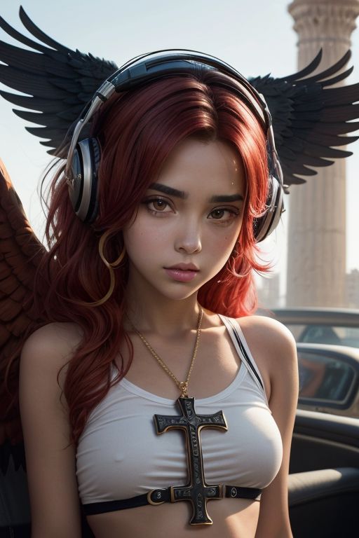 , solo, portrait of goodisis, goodnes ornate, egypt, energy, aura, dust, debris, Face looking, tanned skin, women, Ankh Cross, wings, ankh, Black Eyeliner Ariana Grande-Butera cyber punk Red hair Cara Jocelyn Delevingne lineage 2 blond green skin - bikini