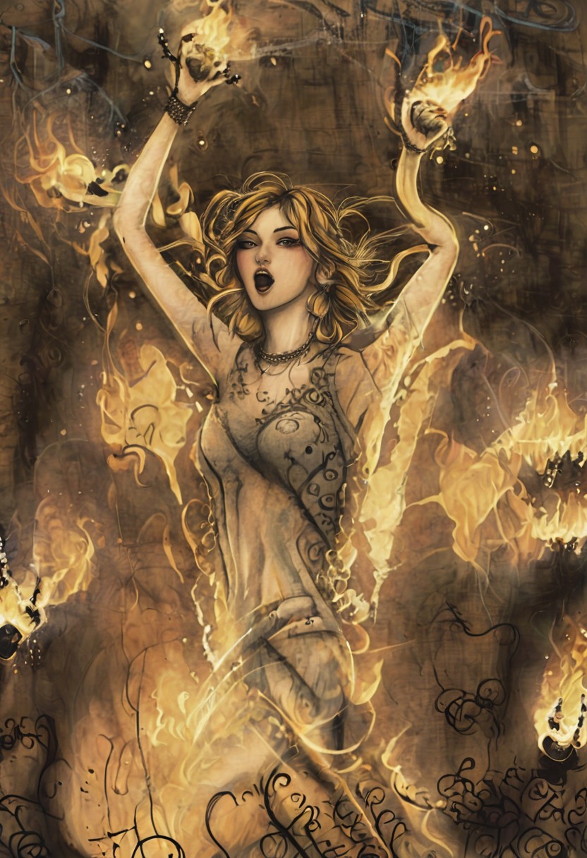 <lora:tbh220-sdxl:0.9>,illustration,style of Jessica Galbreth,punk rocker girl, playing air guitar, big speakers left and right.in the bottom corner you can see the outline of cheering fans holding torches.