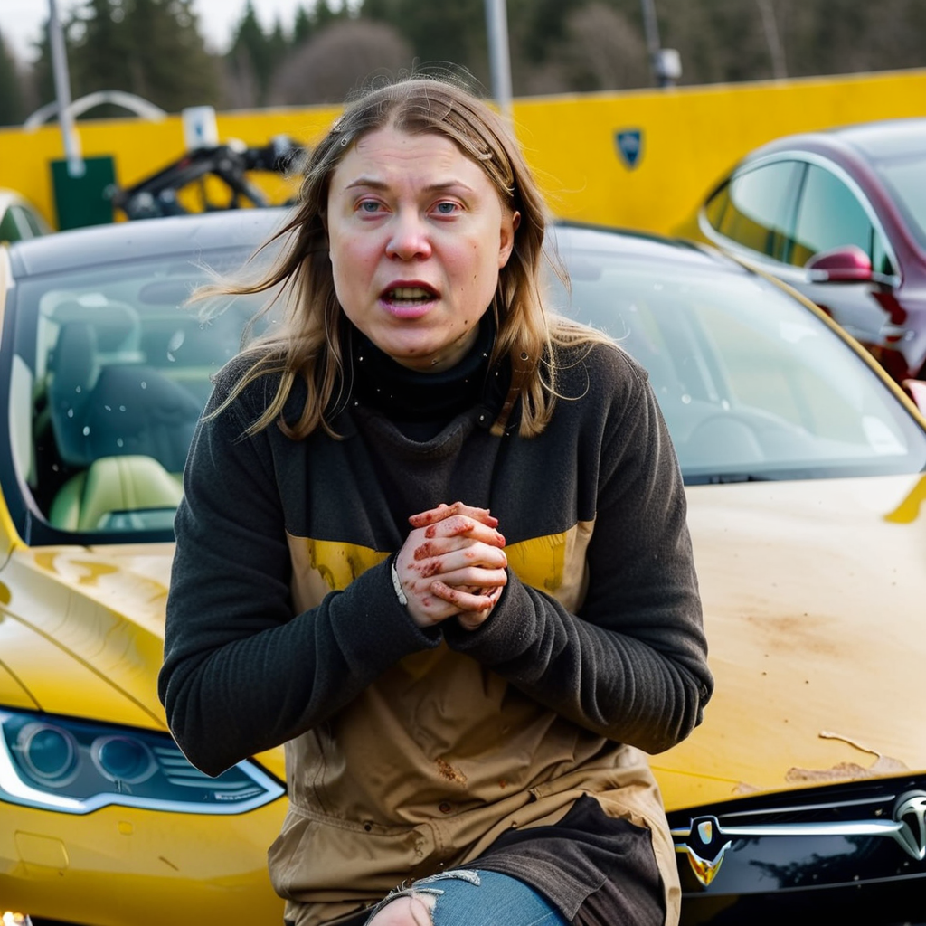 upset but hungry and dirty greta (((freezing to death))) can see invisible CO2 , dirty, cold, <lora:greta:1>, yellow tesla car