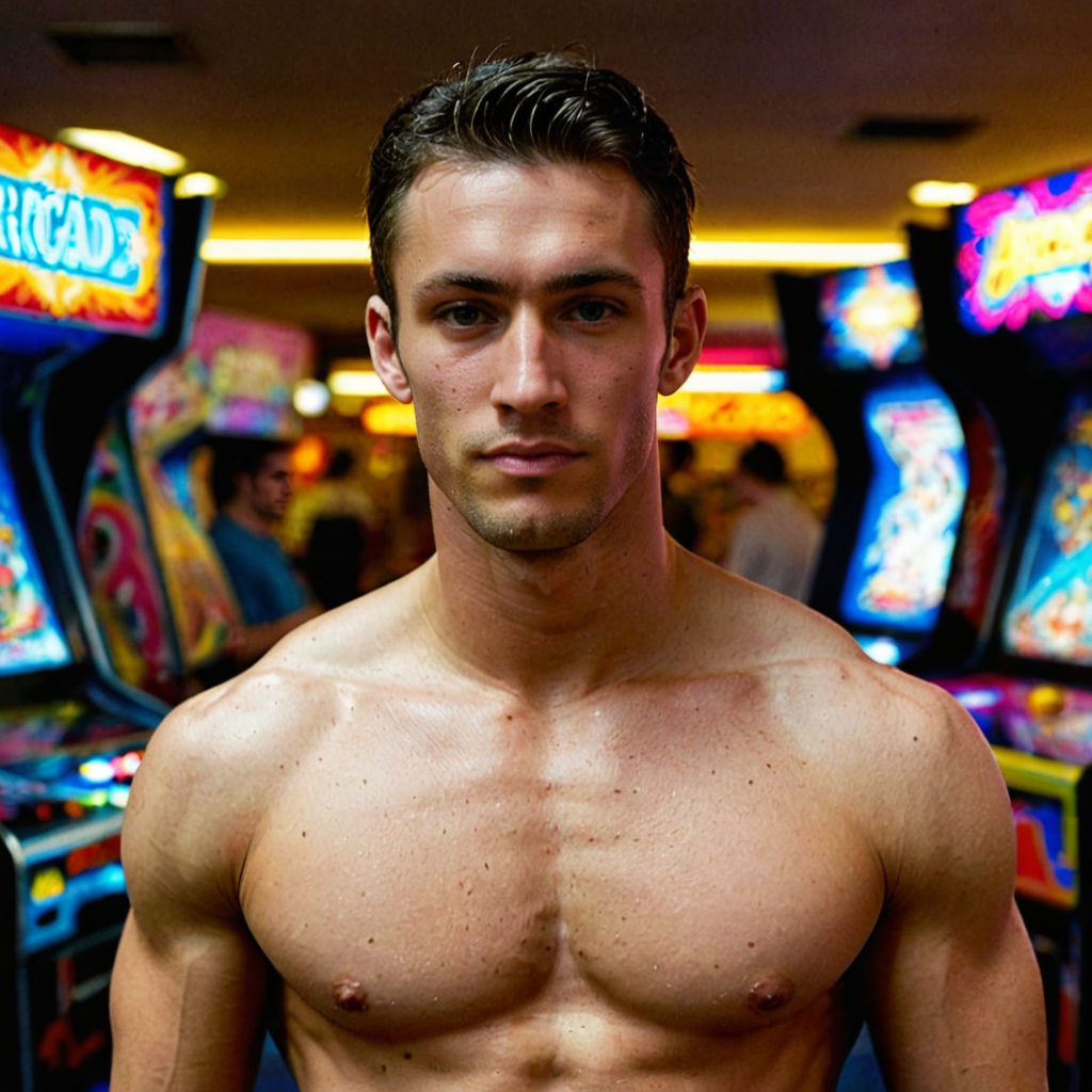 close-up photo of a man, shirtless, at an arcade, looking at camera, <lora:megfox_xl_1_standard_merger_23_41_07_03:1>