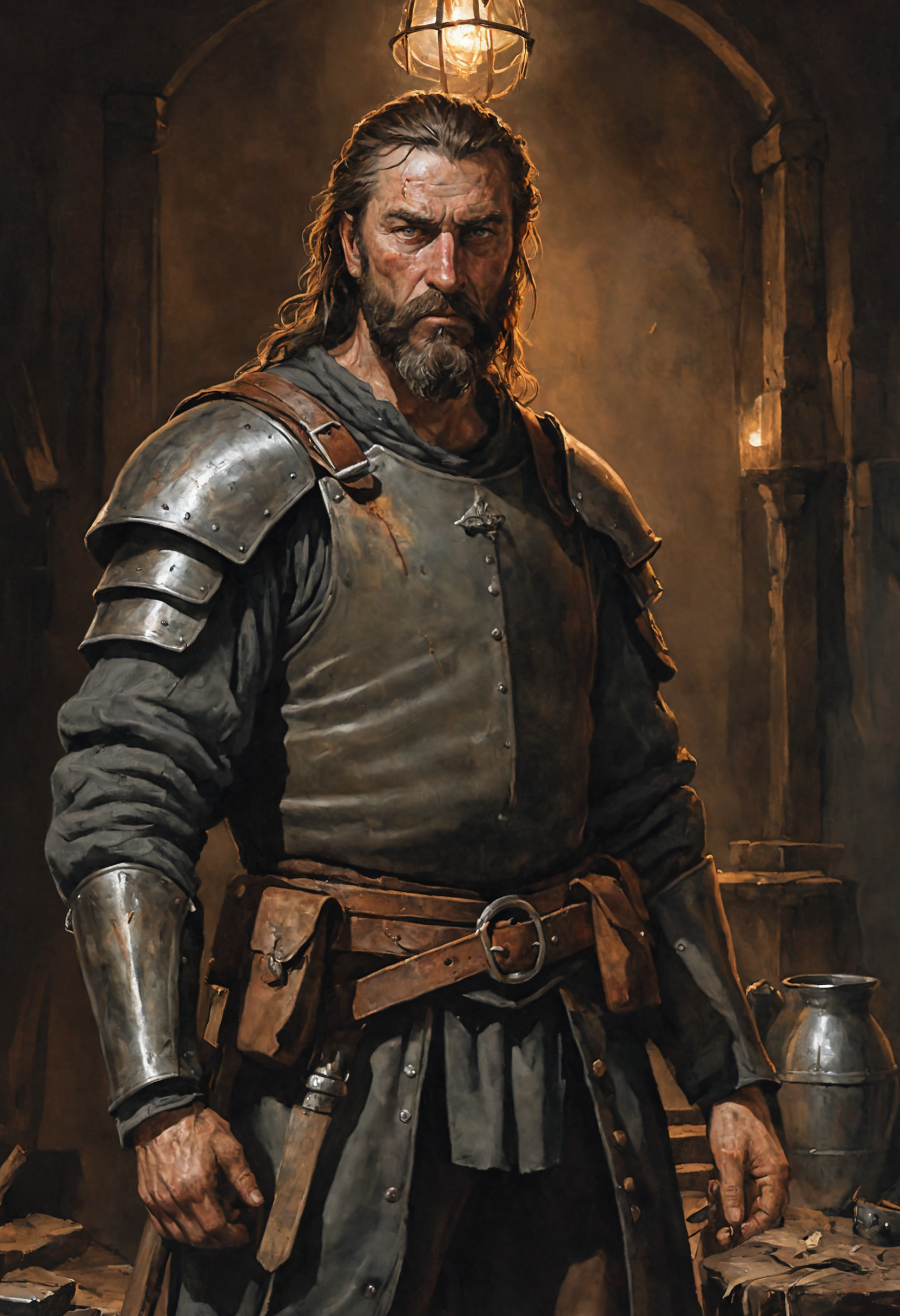 highly detailed (realistic cartoon art) portrait of a seasoned human (medieval mercenary:1.1) wearing leather and plate armor in a seedy tavern, leather belts and pouches, rust and dents and (smudges of blood:0.8), (topknot hair:1.1) and ragged full beard with streaks of grey, threatening posture, battle-hardened, grim and determined, dim dynamic lantern light, dark mood. (grim fantasy art:1.1). (realistic digital painting:1.1), (fantasy rpg character concept art:1.1), high quality, (cartoon art:1.1), <lora:NicolaSamori:1.1>, celshading, visual novel,