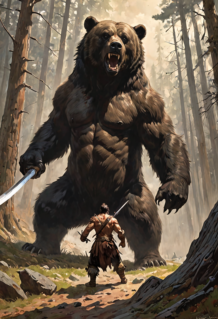 Medium: Digital painting Subject: A man fighting a bear Style: Fantasy Artistic Influence: Frank Frazetta Website: ArtStation Resolution: 1024x768 Additional Details: The man is wearing a sword and the bear is standing on its hind legs. Color: The image is mostly white, brown, and gray. Lighting: The light is coming from the top left of the image.