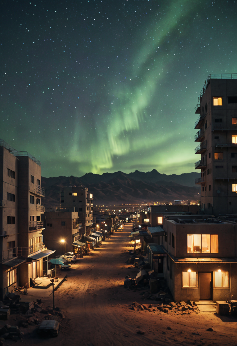 brutalism style, desert, Asian town, dystopia, sci-fi, gloomy, moody, cinematic, dynamic lighting, bokeh, aurora, film, bokeh, professional, 4k, complex detail, film grain, noisy, chromatic aberration, <lora:xl_more_art-full_v1:0.5>, <lora:add-detail-xl:0.3>