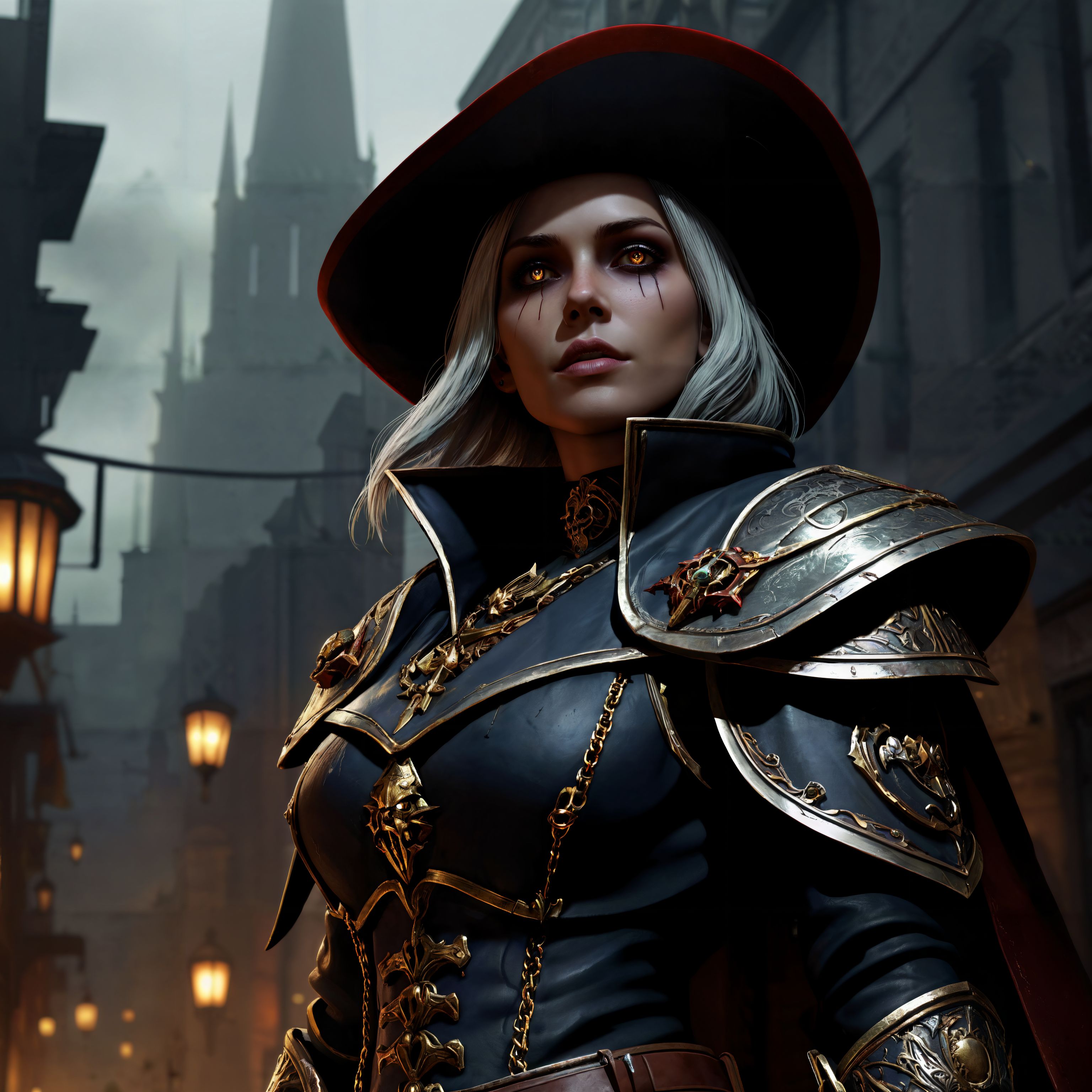 Generate a stunning art style, a true [masterpiece] [best quality] of art. The image showcases [detailed linework], [dynamic shading], and [dramatic lighting], bringing to life a [dreading atmosphere, grim dark coloures] . In the background a [dark alley, gothic city, warhammer 40k, fog] is to be seen in [grand:1.8, high-scale:1.8, panorama:1.8] from [from below]. A inquisitor, solo, close-up, standing, from above . She is wearing a [hat, long coat, detailed full armour, necklace, emblem].
