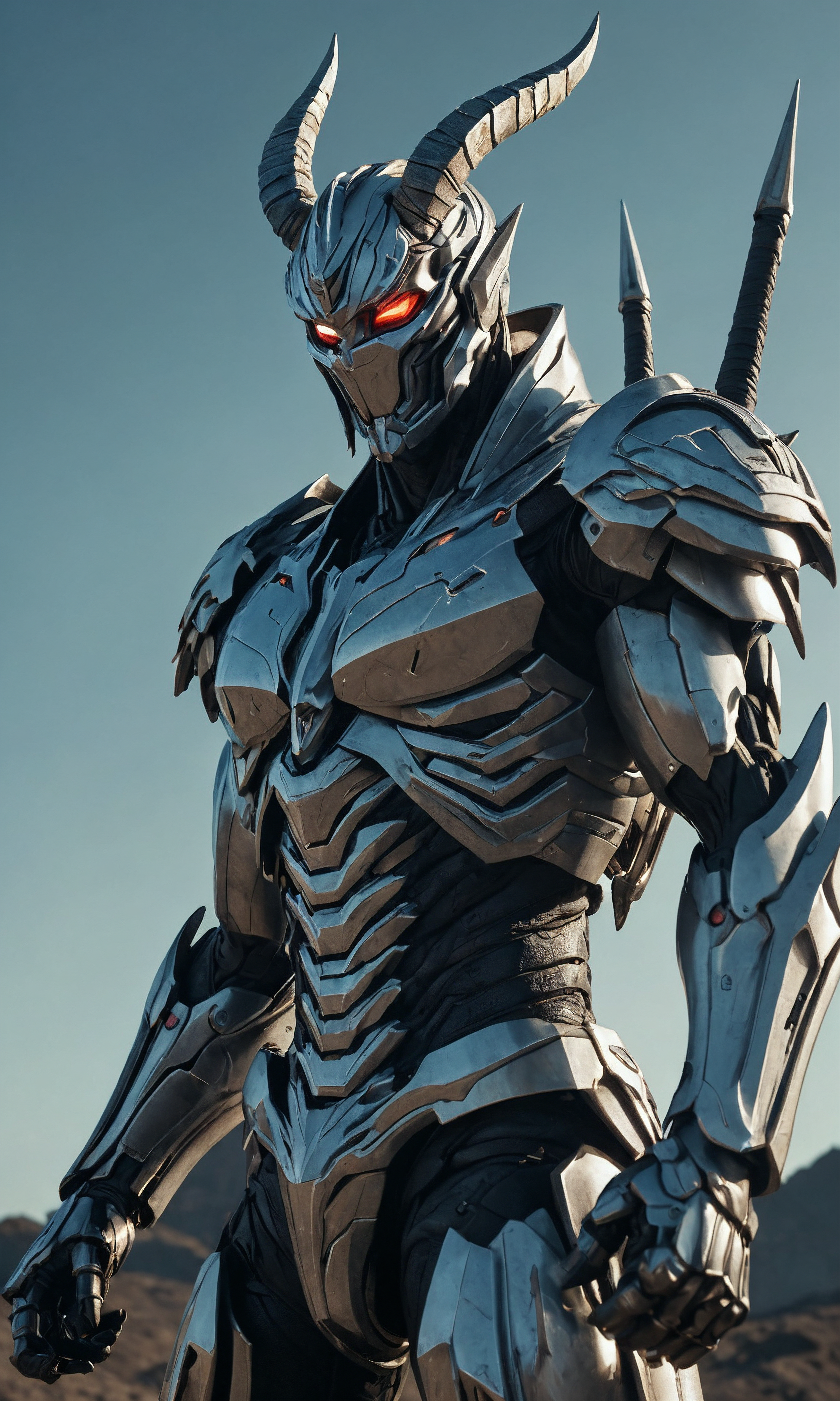 low-angle, awe-inspiring, dystopia, plasma katana, Genji, Faun, goat, oni, lava, megatron from transformers 2007, sorayama, Frostmourne, titainum, taken by Tim Flach, cinematic, movie, movie still, cinematic lighting:1.2)