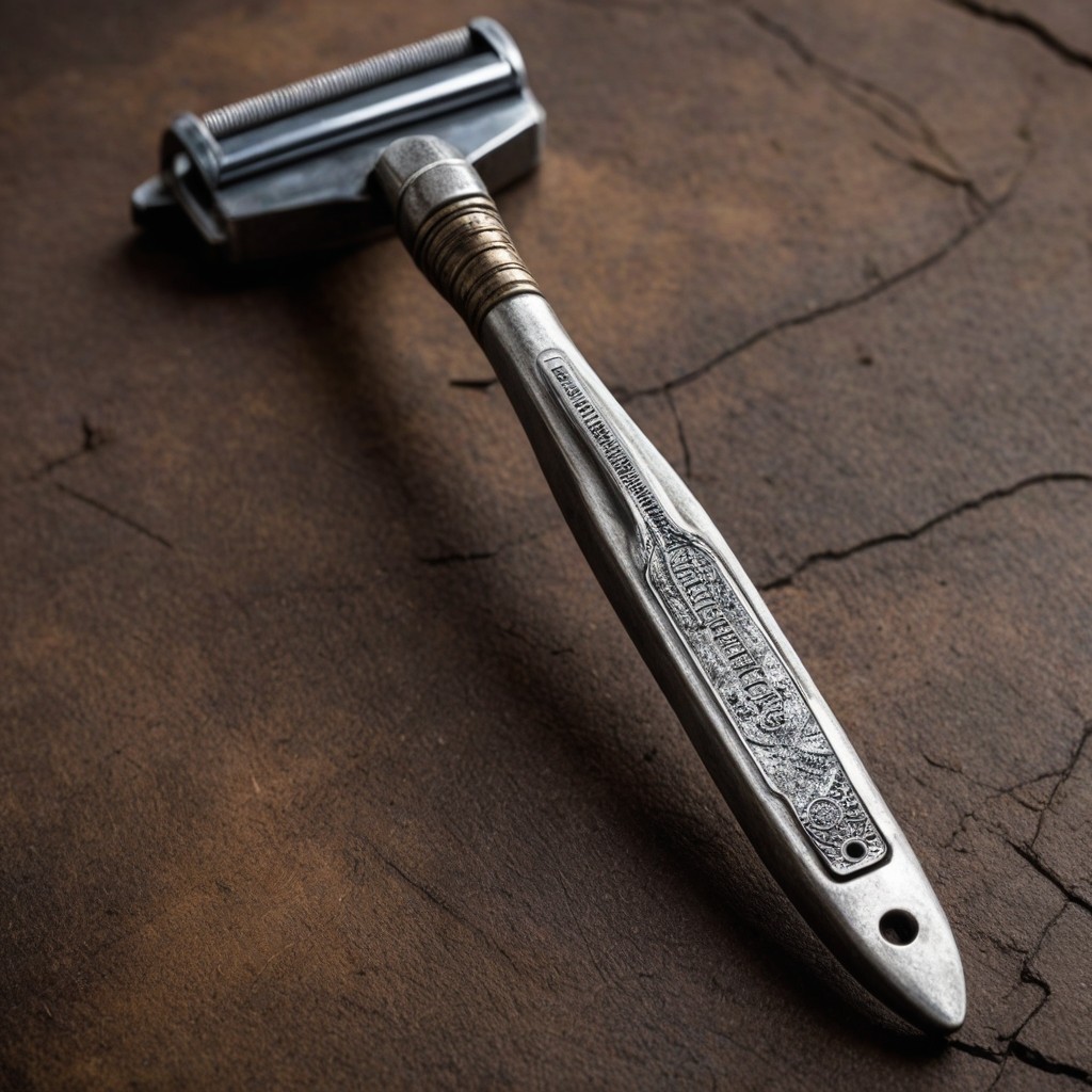 text "FANTASTIC CLEAN BEST DEAL" product advertisement picture of experimental science fiction shaving razor dangerous rusty blades for military with knife blade at back of handle, masterpiece, best quality, high quality, highres, ultra-detailed