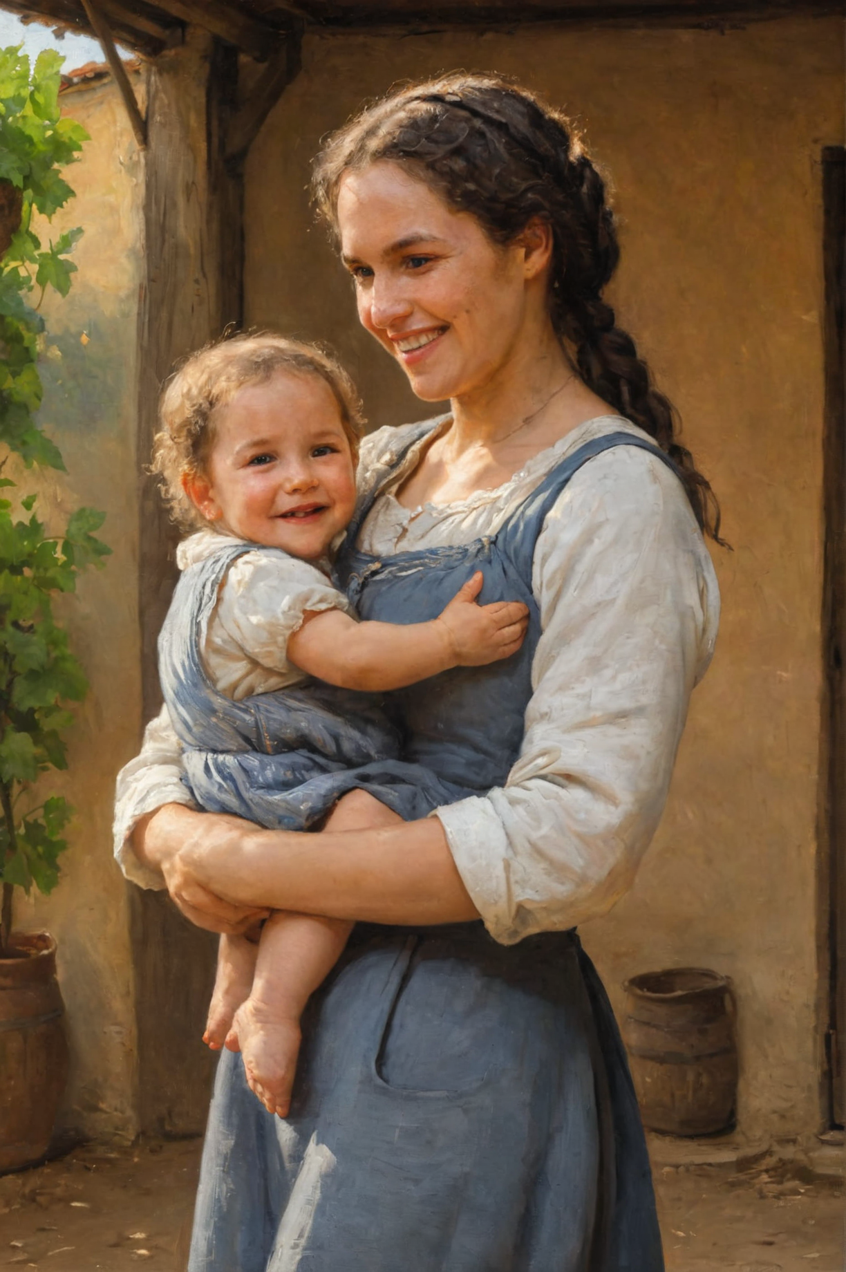 A woman holds a child in her arms, smile, (laughter:0.5), a peasant woman from the 19th century, The village house, warm light, summer in the style of nicola, <lora:ClassipeintXL1.9:0.8> <lora:add-detail-xl:1> <lora:NicolaSamori:1>, (best quality, 8K, high resolution, extreme detail, HDR, outstanding composition:1.4),