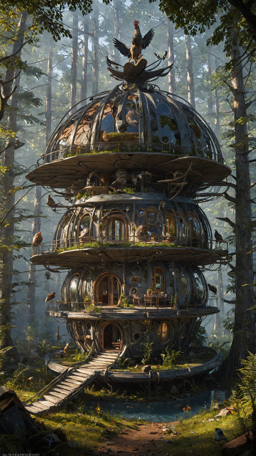 (incompatible, high fashion, but extremely beautiful:1.4),(complex details, masterpiece, best quality:1.4),in the style of Nicola Samori,futuristic style,elegant,modern,ultramodern,high-tech,detailed,((steampunk (little small house),((on a high+++ support in the shape of a chicken paw)),In the middle of the forest, in a clearing, there is an old wooden small hut)) and ((completely submerged in forest))+,Night,moonlight,the light++ in the portholes,<lora:å¹»æ³ä¸ç · æ¦å¿µèºæ¯ _ FantacyWorld_v1.0:1>,