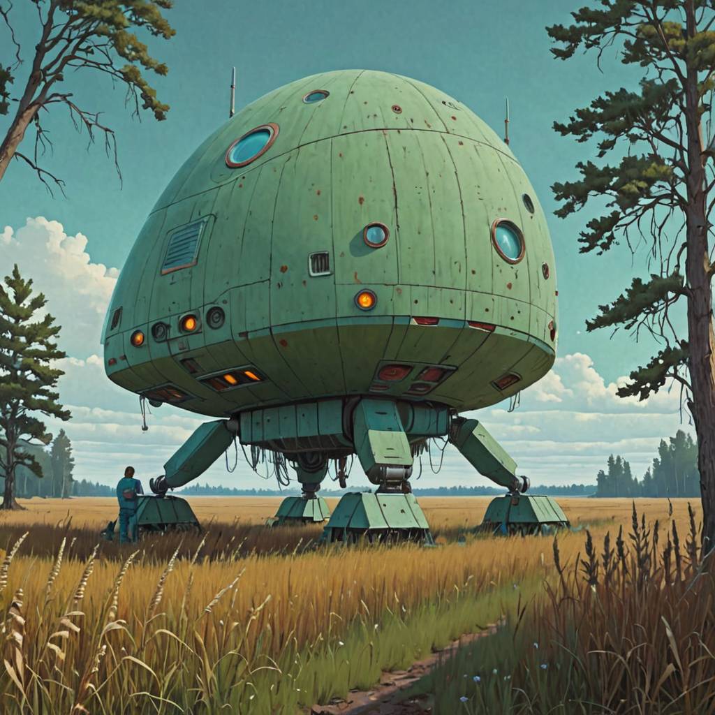 (great plains:1.5) new a row of spaceships (overgrown:1.3) <lora:Simon_Stalenhag_LFTL_SDXL:1> Simon Stalenhag style Light Khaki,Cruise