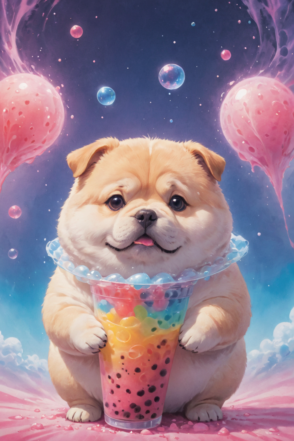 cosmic canvas,flawless, clean, masterpiece, professional artwork, famous artwork, painting of a chubby dog, (bubble tea background), <lora:Cosmic_Canvas_SDXL:1>