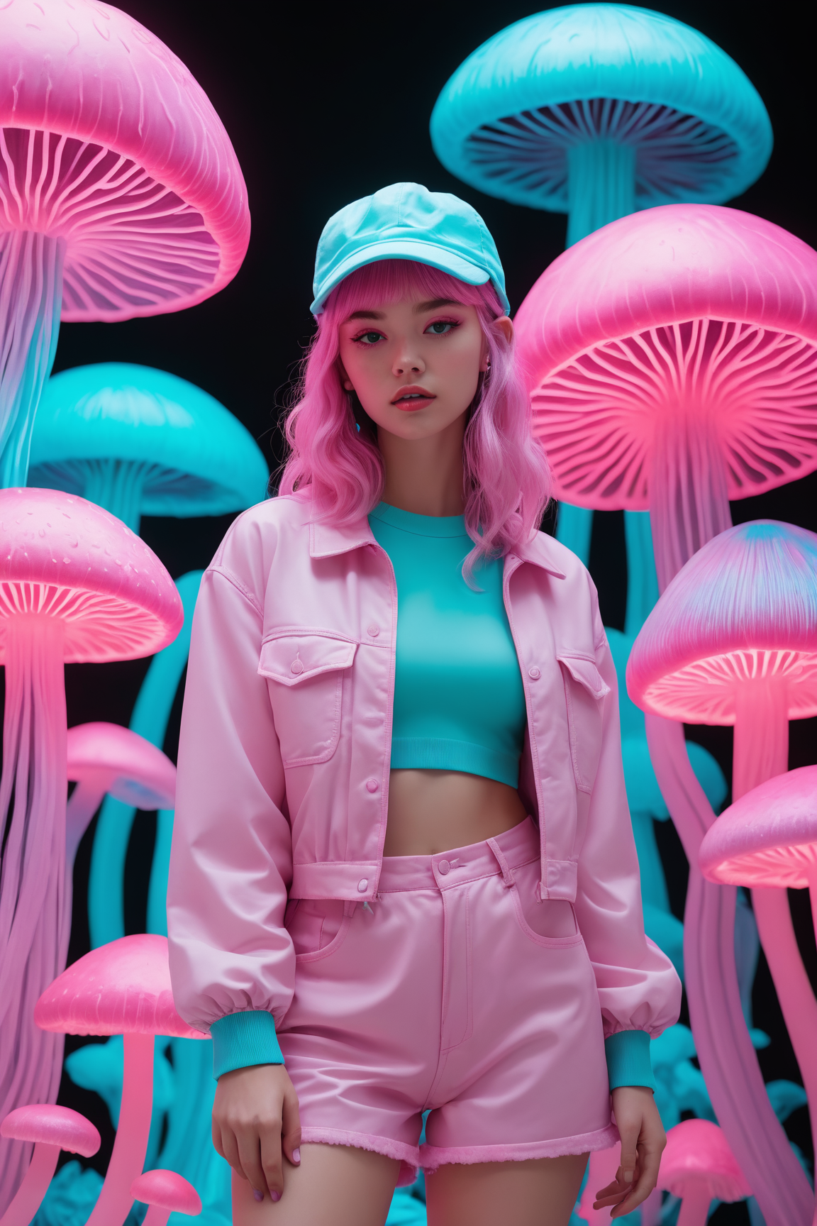 neon outlines art, a fasion show, cutecore, vaporwave, glowing, fluffy, fuzzy, iridescent, colorful, mushroom and jellyfish-themed, pink and teal color theme