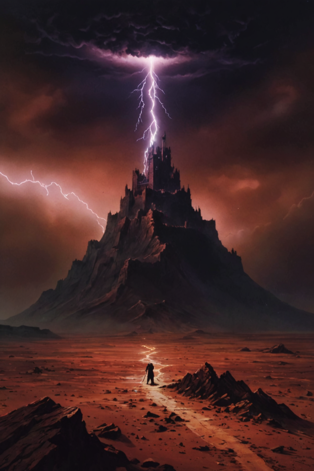 evil medieval wizards tower, on mars, lightning, dark skies, mountains <lora:xl_yoshiaki_kawajiri_v1:0.8>