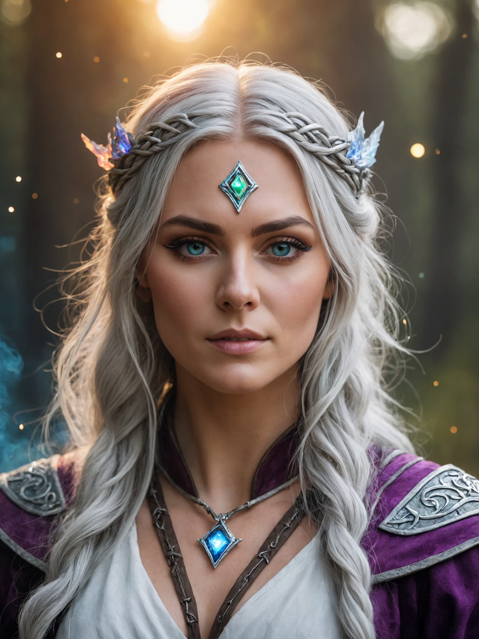portrait photograph beautiful norse female mage, wild hair, 8k, masterpiece, magic rainbow smoke spell, magic rainbow sparks, magic rainbow glow, white magical luminous hair, glowing luminous eyes