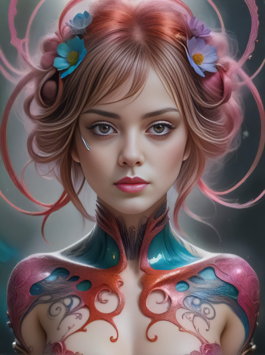 psychedelic style abstract beauty, goth girl, tattooed, red and pink strands, centered, looking at the camera, approaching perfection, dynamic, twilight, highly detailed, digital painting, artstation, concept art, smooth, sharp focus, illustration, art by Carne Griffiths, vibrant colors, swirling patterns, abstract forms, surreal, trippy, <lora:more_details:0.8>, <art by mooncryptowow:0.6>,
