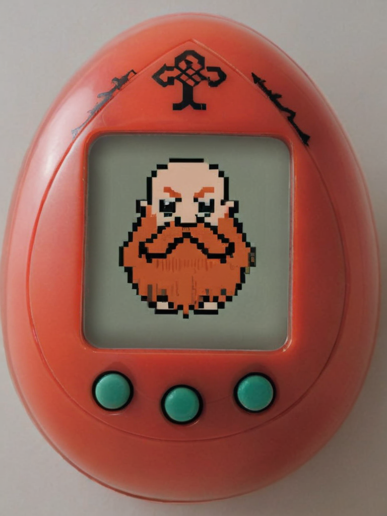 an egg-shaped, virtual pet device is featured with a central screen displaying a 16bit Harry_Dwarf <lora:Harry_Dwarf_1.5:0.8> <lora:egg_bit:0.8>, The screen is encased within a hairy ring, long red beard, braided moustache, bald, underground,