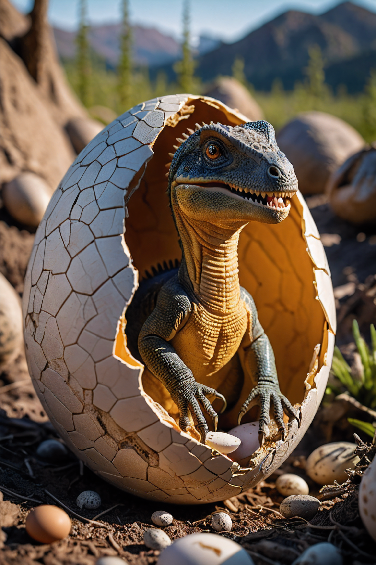 small dinosaur hatching from an egg, sitting inside of a cracked egg shell, primeval landscape, photorealistic, hd, dramatic lighting, Intricate, vibrant colors, highly detailed, centered, sharp focus, RAW photo, high quality, film grain, Fujifilm XT3 <lora:add-detail-xl:2>
